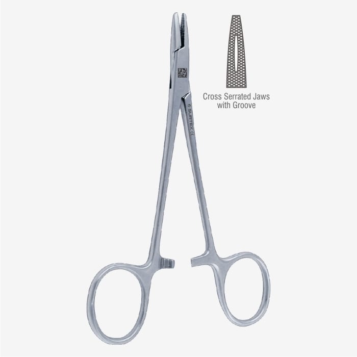 Furthermore, the cross-serrations and grooves on the inner aspects of the jaws optimize the handling of curved needles.